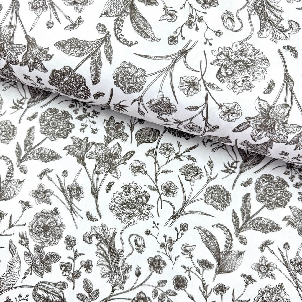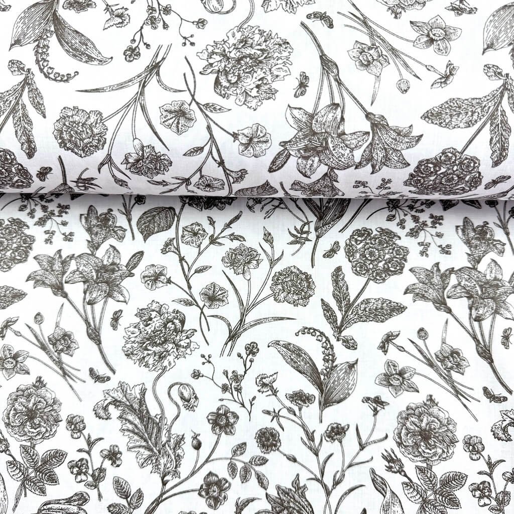 Baumwolle gemustert - Graue Wiesenblumen auf Weiß