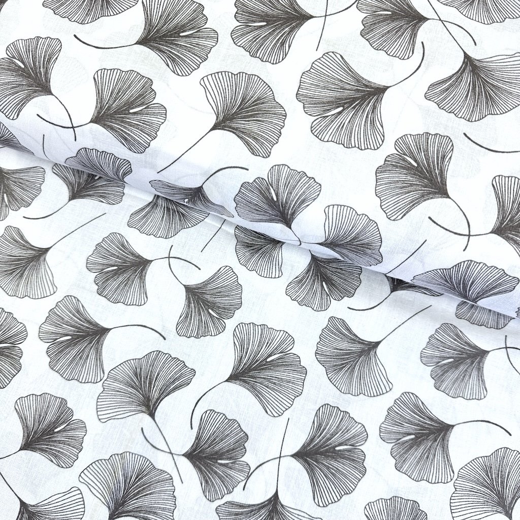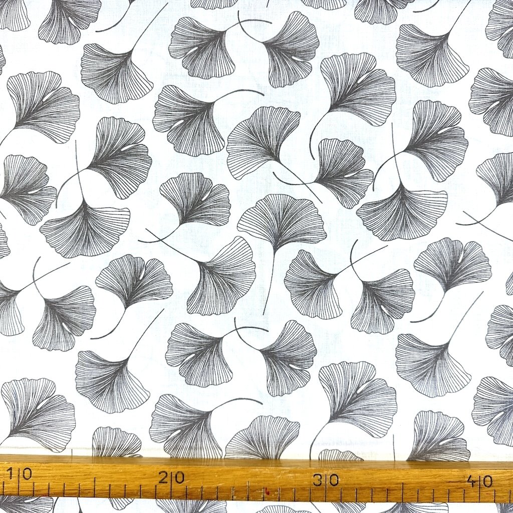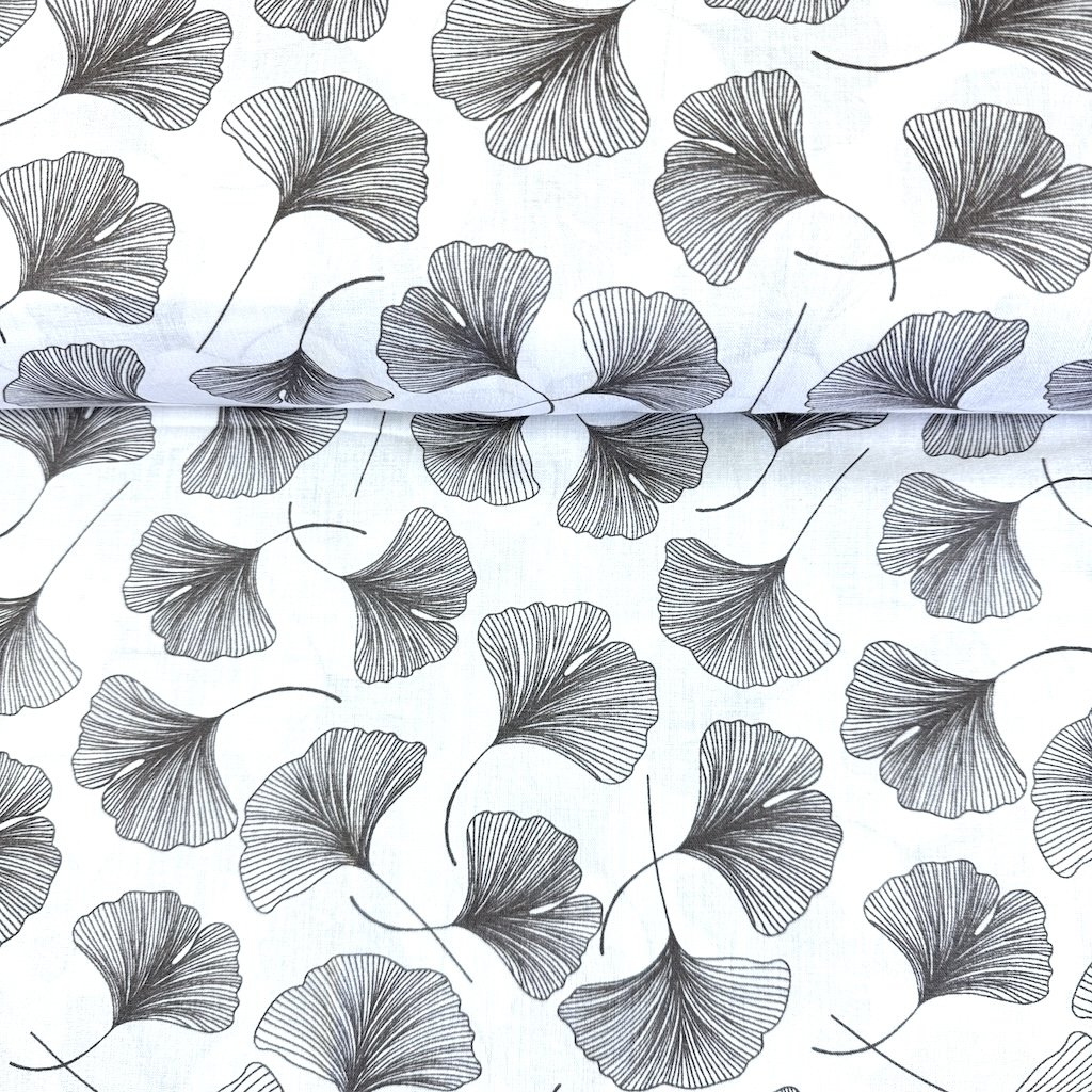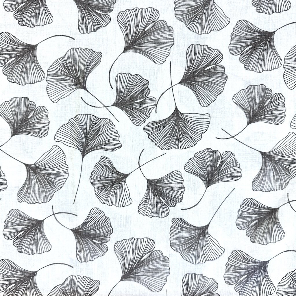 Baumwolle gemustert - Grauer Ginkgo auf Weiß