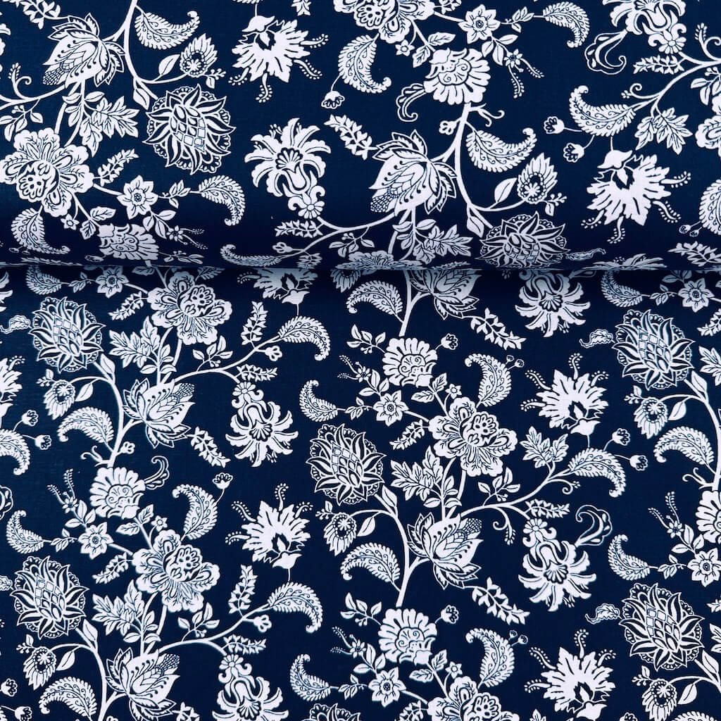 Baumwolle gemustert - Weiße Blumen auf Dunkelblau