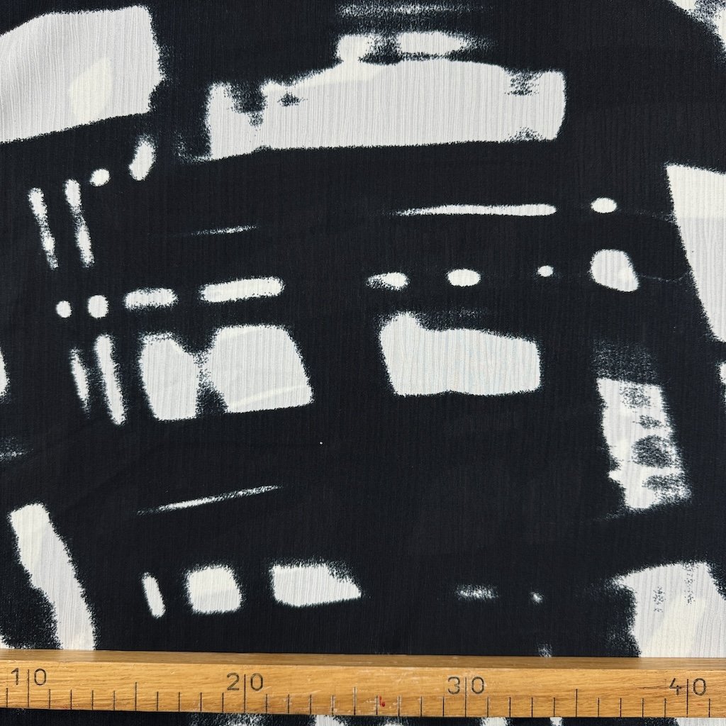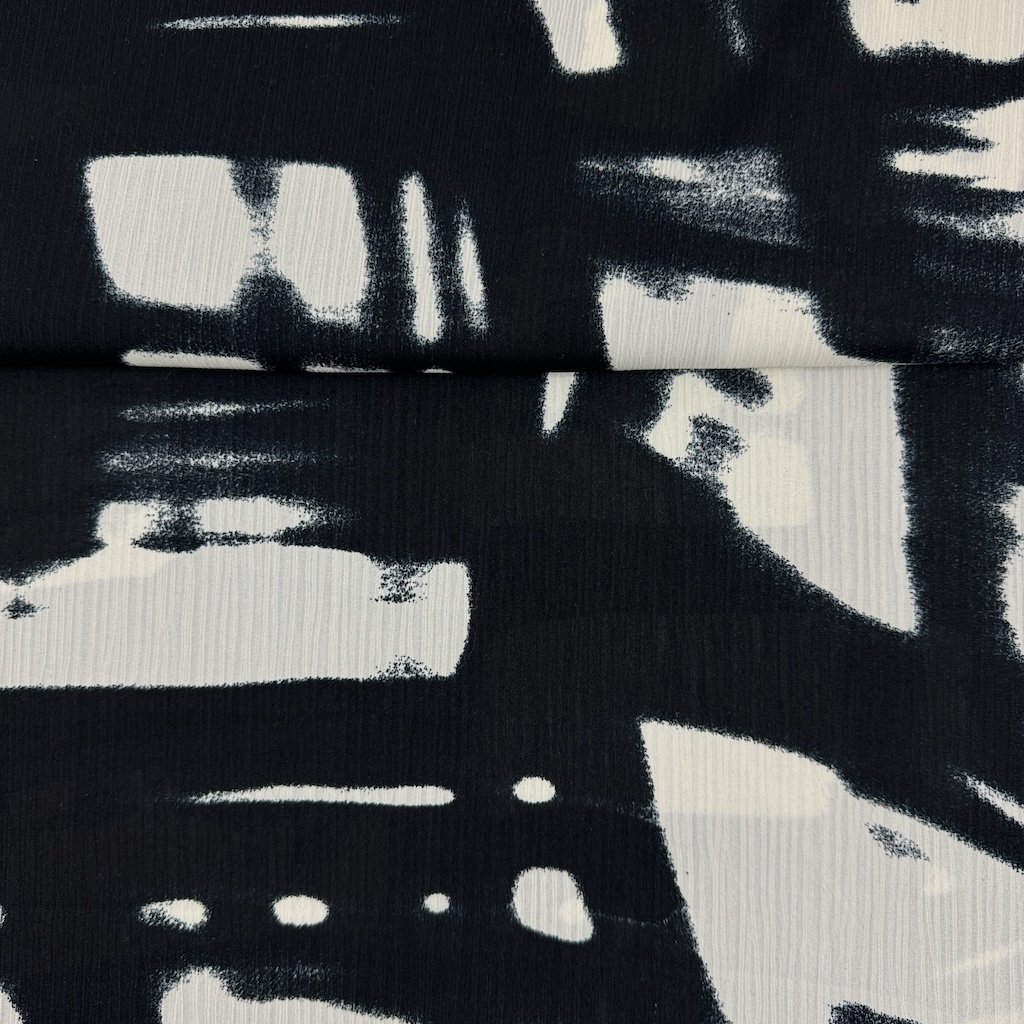 Gemusterter Chiffon ist ein leichter, transparenter und feiner Stoff mit einer glatten Oberfläche und einem luftigen Erscheinungsbild. Er eignet sich ideal für die Herstellung eleganter Kleider, Blusen, Schals oder Röcke благодаря seiner Eleganz und seinem angenehmen Tragekomfort. Die gemusterte Variante verleiht dem Stoff einen interessanten visuellen Effekt und ist perfekt für besondere Anlässe.