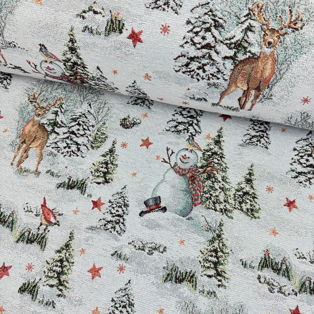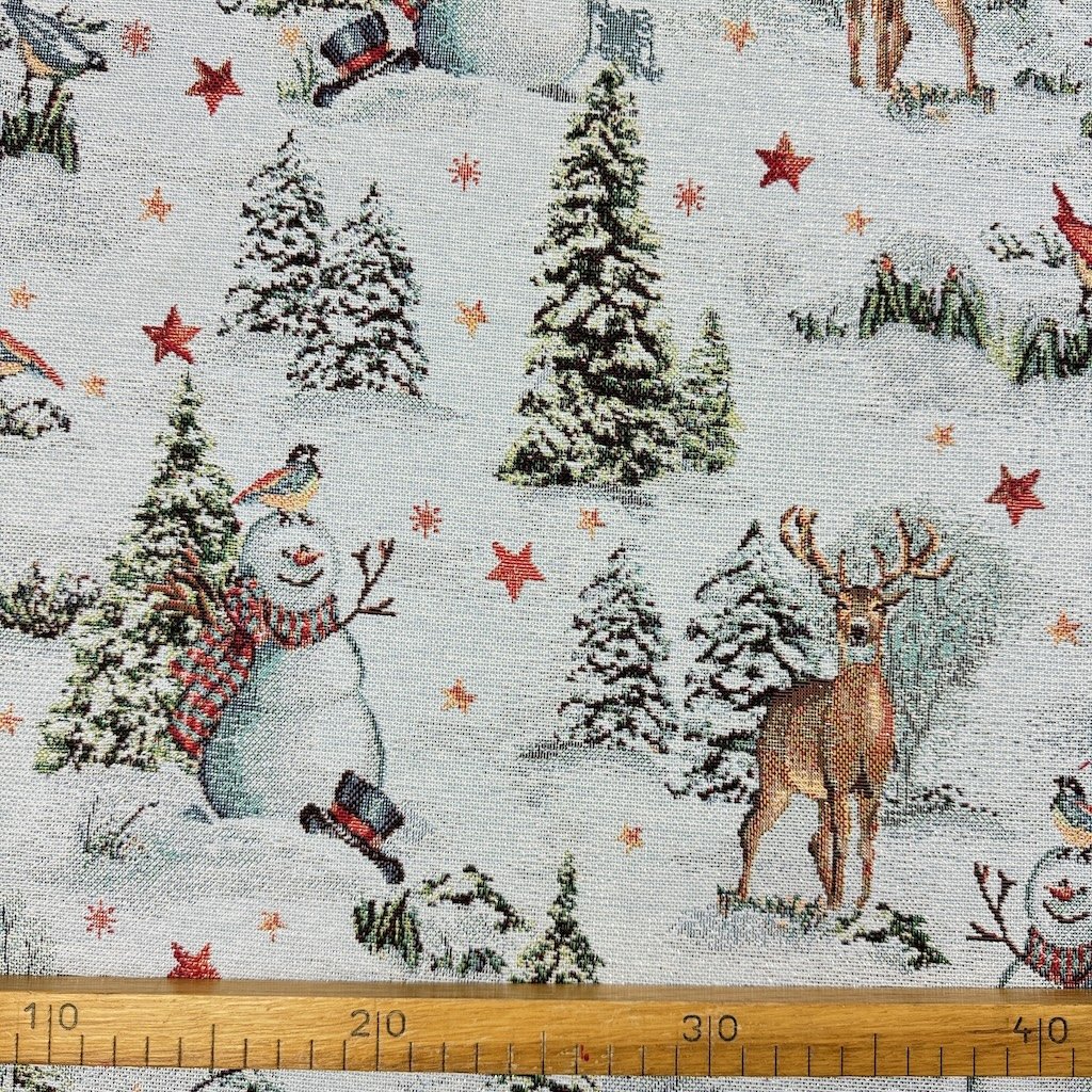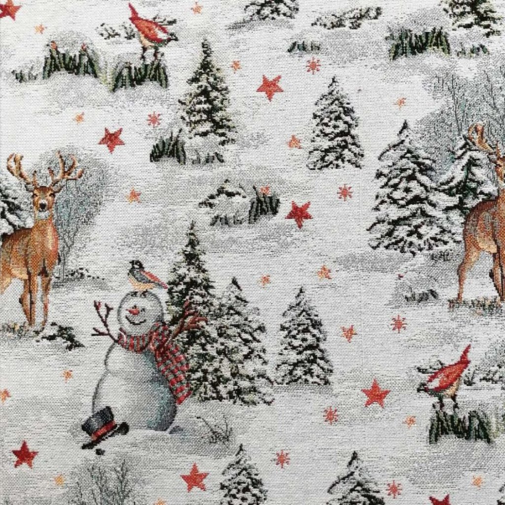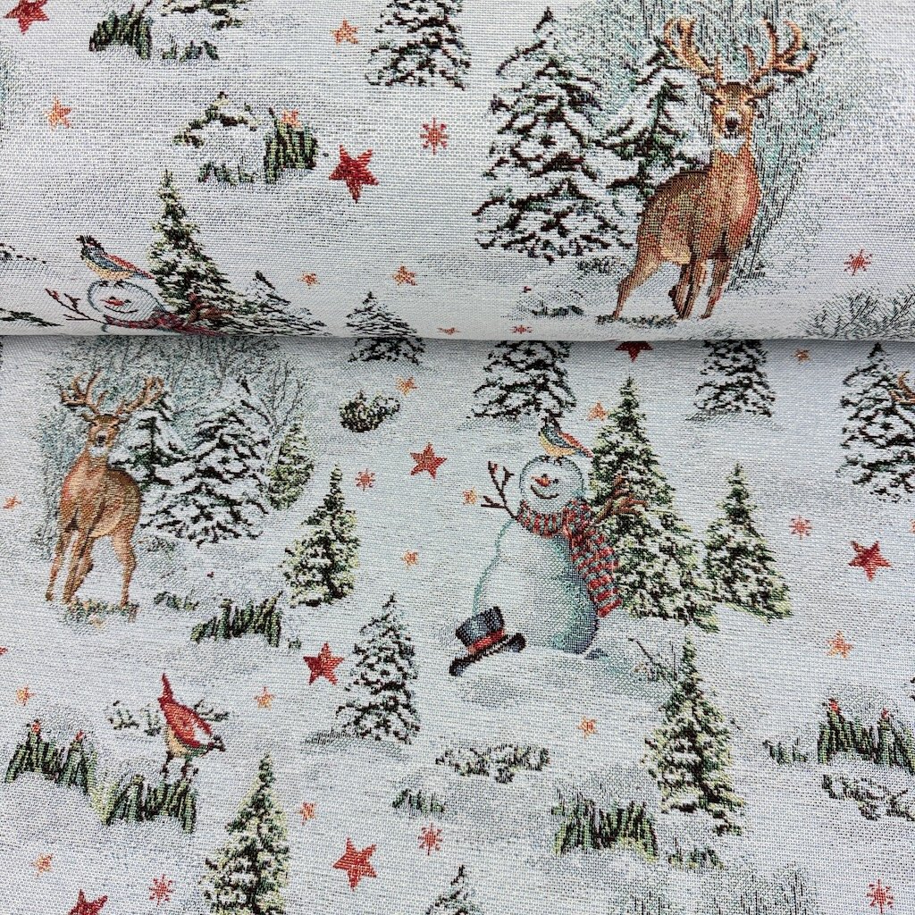 Gobelin Weihnachten - Lurex Schneemann mit Hirsch auf Grau