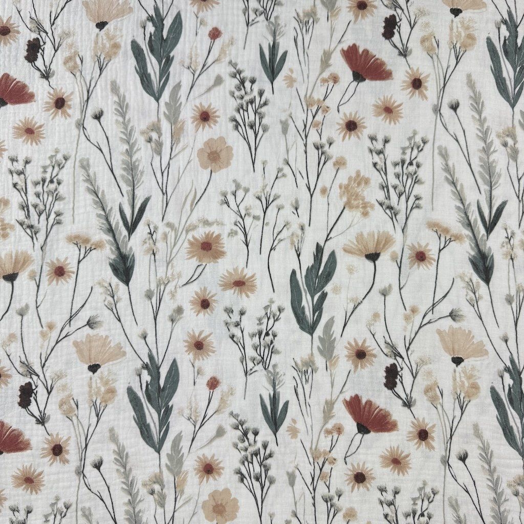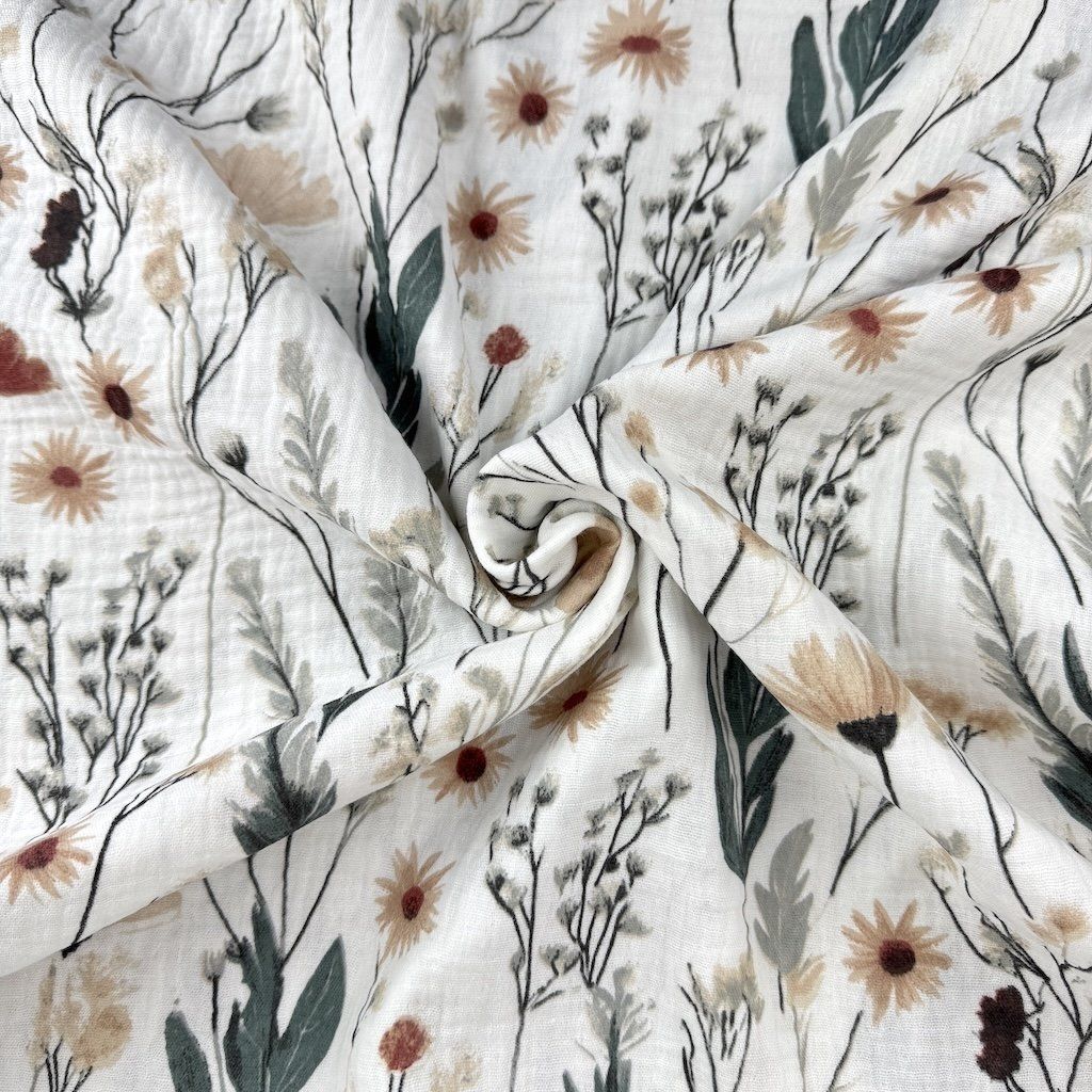 Gemusterter Musselin / Doppelgaze, auch als Mullstoff bekannt, ist ein feiner, luftiger und besonders angenehmer Stoff aus 100 % Baumwolle. Dank seiner typischen gekreppten (gewellten) Struktur ist er von Natur aus leicht elastisch, weich im Griff und bügelfrei. Die doppelte Gaze sorgt für Stabilität, während Leichtigkeit und Atmungsaktivität erhalten bleiben. Elegante Muster verleihen dem Stoff eine originelle Optik, die sich ideal für Kinder- und Damenbekleidung sowie für Wohnaccessoires eignet. Musselin ist besonders beliebt für Sommerkleider, Blusen, Röcke, Hemden, Babybodys, Einschlagtücher, Decken oder Tücher.