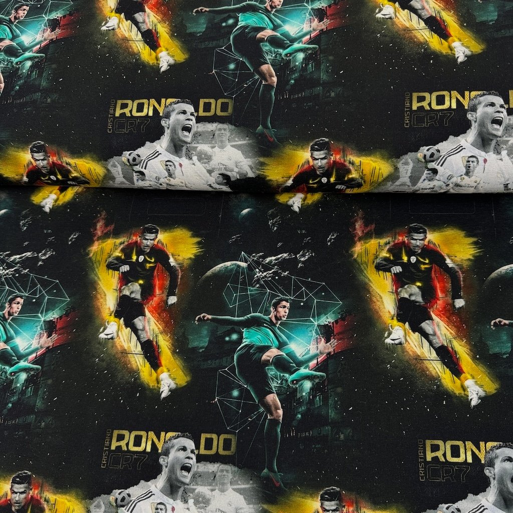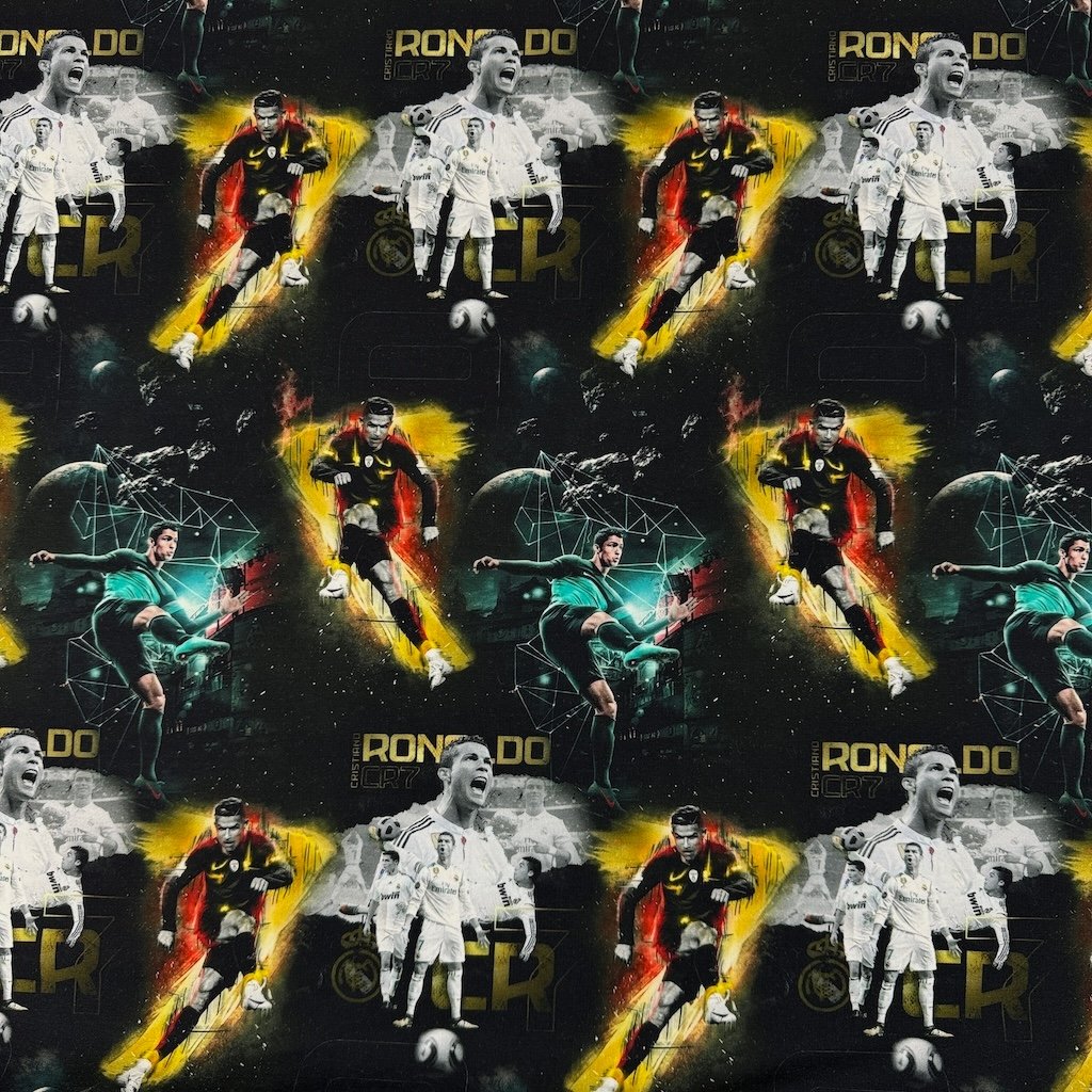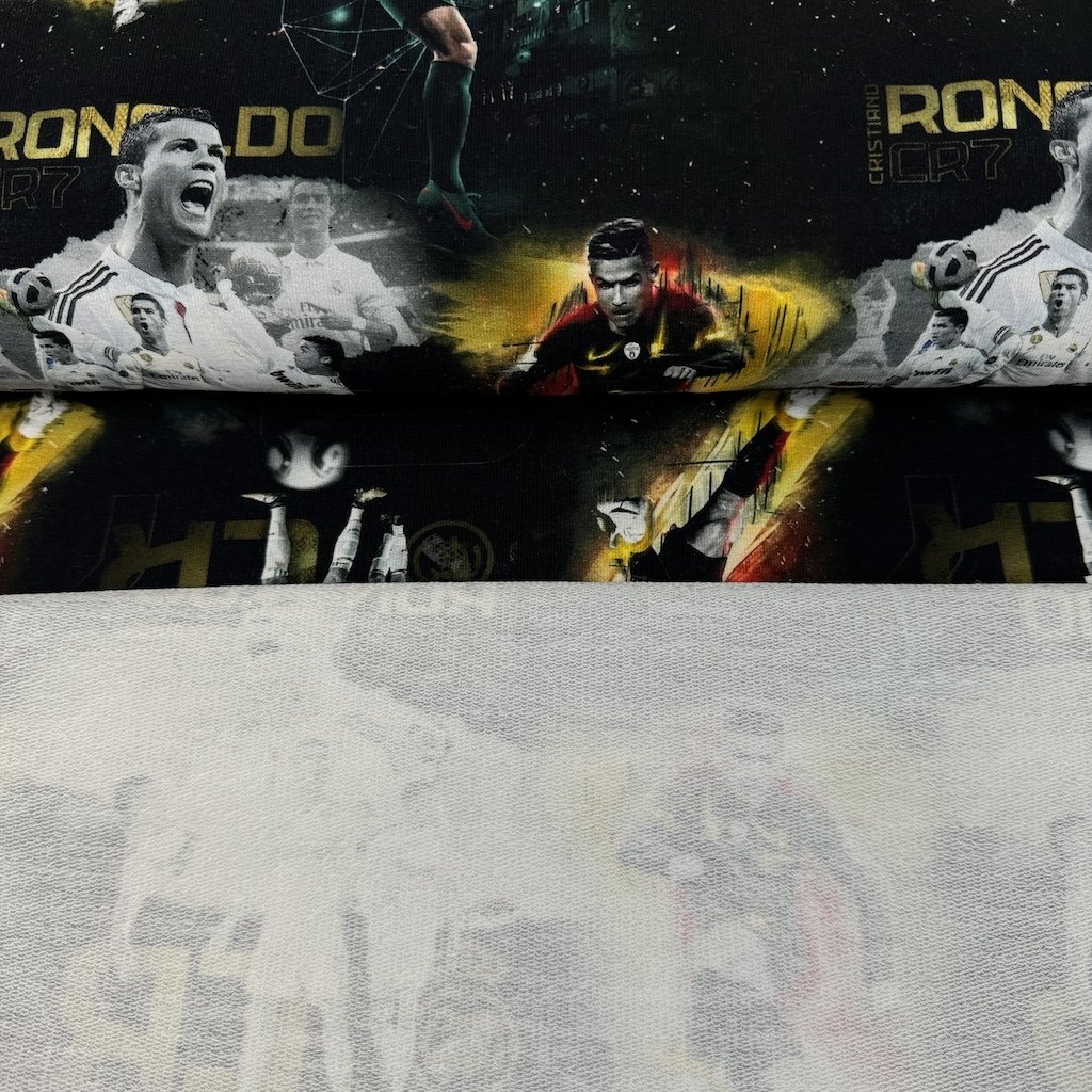 Hochwertiges Gestrick mit Digitaldruck für hohe Farbechtheit und Auflösung. Lycra-Wirkware mit einem Gewicht von 230 g/m2, mit einer Zusammensetzung aus 95% Baumwolle und 5% Lycra. Es eignet sich für die Herstellung von Trainingsanzügen, Sportbekleidung, Sweatshirts, Kleidern, Tuniken, Halstüchern, Mützen sowie schützenden Gesichtsabdeckungen.