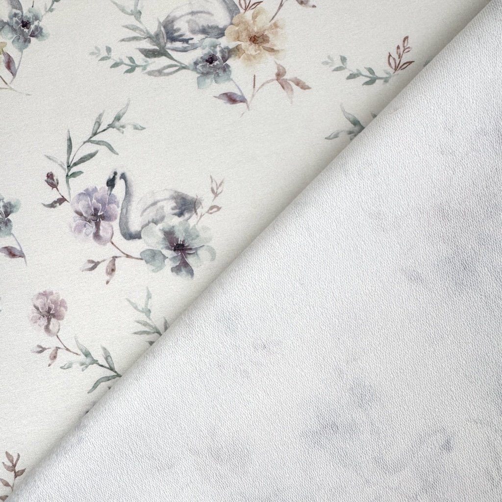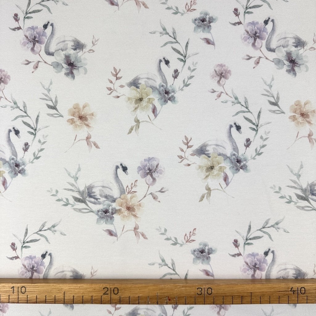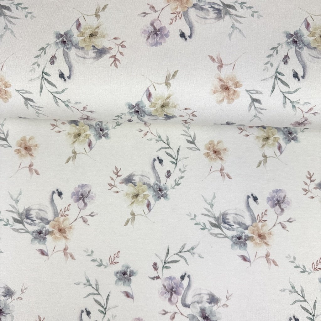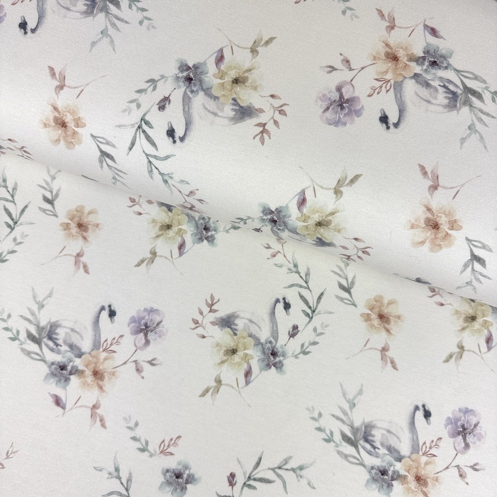 Sweatstoff digital Organic - Blaue Schwäne auf butterfarbenem