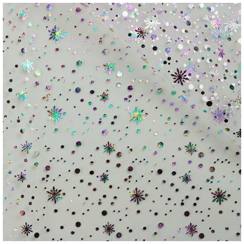 Tüll mit mehrfarbigen, leuchtenden Applikationen, ideal für eine Vielzahl von kreativen Kreationen. Er wird zur Herstellung von Partydekorationen wie Schleifen, Bändern oder Hängedekorationen für Geburtstage, Hochzeiten und andere besondere Anlässe verwendet. Auch beliebt zum Nähen von Tanzkostümen, dekorativen Details an Kleidern, Röcken und Accessoires wie Schals, Stolen, Haarschmuck, Schuhschleifen, Blumen und Taschenverzierungen.