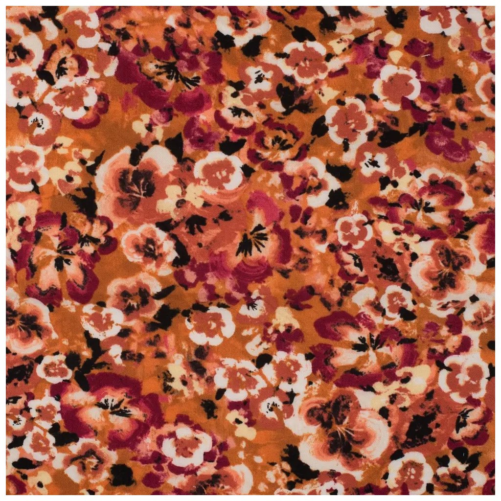 Dieses leichte gewebte Material hat ein Blumenmuster mit abstrakten und leicht verschwommenen Blüten. Die fünf dominierenden Farben sind Orange, Rot, Weiß, Schwarz und Gelb, die zusammen einen zarten und romantischen Look schaffen.
